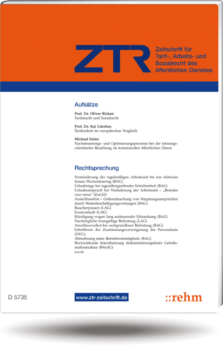 Die Zeitschrift für Tarifrecht (ZTR) ist das übergeordnete Forum für die aktuelle Diskussion tarifrechtlicher Fragen des öffentlichen Dienstes. Angrenzende Rechtsgebiete wie z.B. das Beamten-, Personalvertretungs-, Arbeits- und Sozialrecht werden berücksichtigt, soweit sich Rückwirkungen auf das tarifliche Geschehen ergeben.