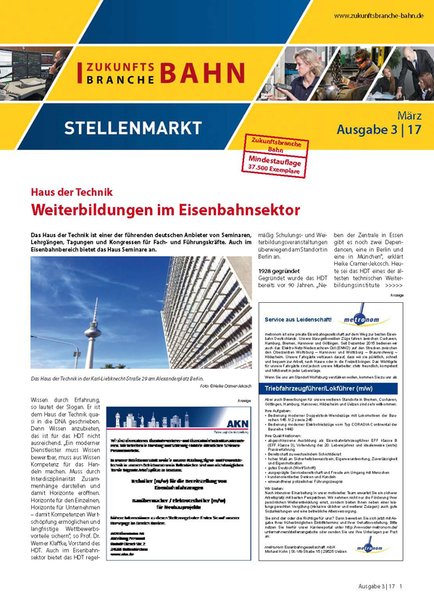 Regelmäßig informiert der Stellenmarkt „Zukunftsbranche Bahn“ als Beilage in Fachmagazin "Privatbahn Magazin" und online auf www.zukunftsbranche-bahn.de über freie Arbeitsplätze und bietet Bewerbern die Möglichkeit, kostenlos ein Stellengesuch veröffentlichen zu lassen.